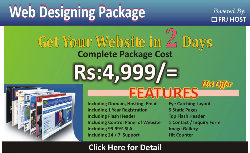 FRJ Host provide a complete web designing / development and webhosting solution we offer customer-oriented web design services and more importantly, deliver them effectively. We provide complete website bundal package Rs:4999/= including .com domain and full supported hosting with 1 year registration.